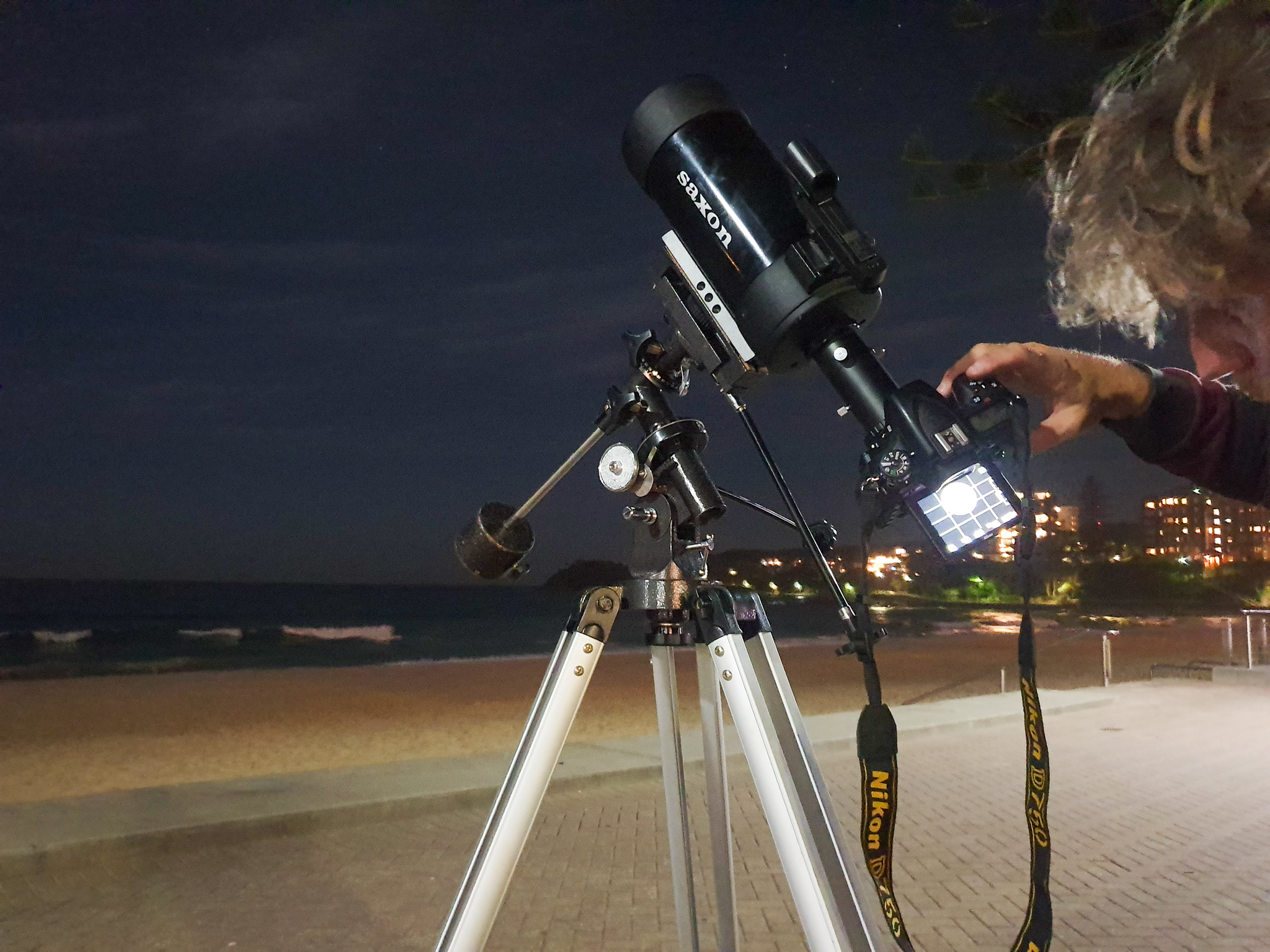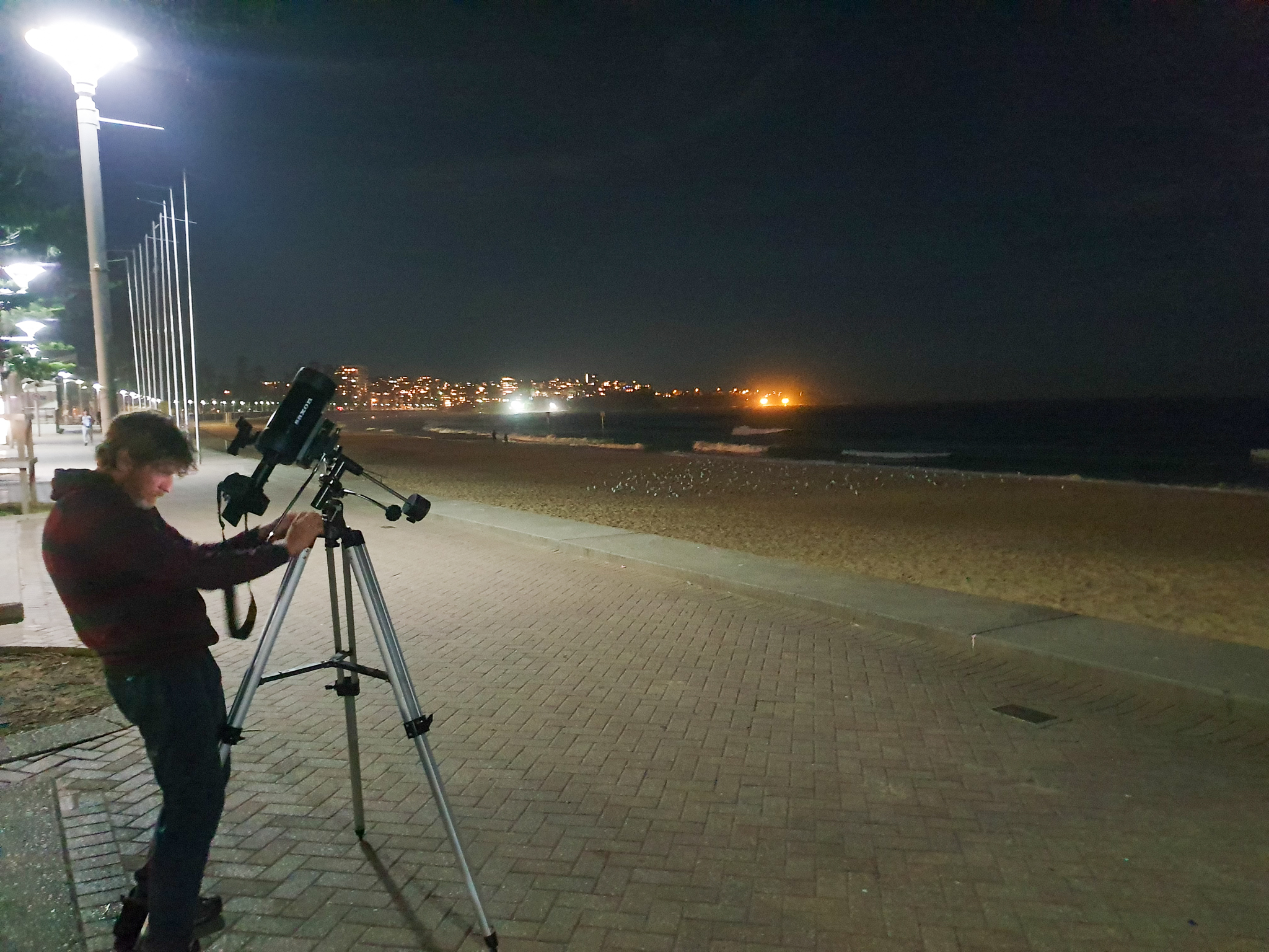 One evening Matt packed up his telescope and camera and we headed across the corso to Manly Beach. There was a bright, full moon and Matt wanted to have another try at photographing the moon. The aim was to take several photos and then lay them over the top of each other using a computer program to bring out a clearer, more detailed image. Success alluded him on this occasion, and to paraphrase Thomas Edison, ‘I haven’t failed, I’ve just found more ways that don’t quite work.’