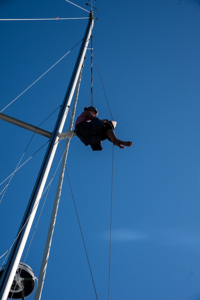 The next morning we decided to make the most of the calm conditions and tackle some repairs to the spreader guards. This involved going up the mast in the bosun’s chair, like Matt did in Lakes Entrance, and sewing some leather patches onto the ends of the spreaders. However, since sewing was the key skill involved, this time it was my turn to head up the mast. We spent most of the day going up and down in the bosun’s chair; measuring, cutting, adjusting and sewing the new guards on. My legs ached from bracing against the mast. It was quite a workout. By the end of the afternoon, we were pretty pleased with our handiwork and thought the new leather guards looked nice and neat and kind of like big band-aids on the ends of the spreaders.