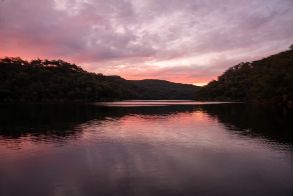 Right up the end of Houseboat Bay was this pretty little waterfall. Matt climbed right up to the top of the rocks to take photos. We then motored through Cowan Creek as the sun was setting, aiming for Brooklyn, which is on the Hawkesbury River.