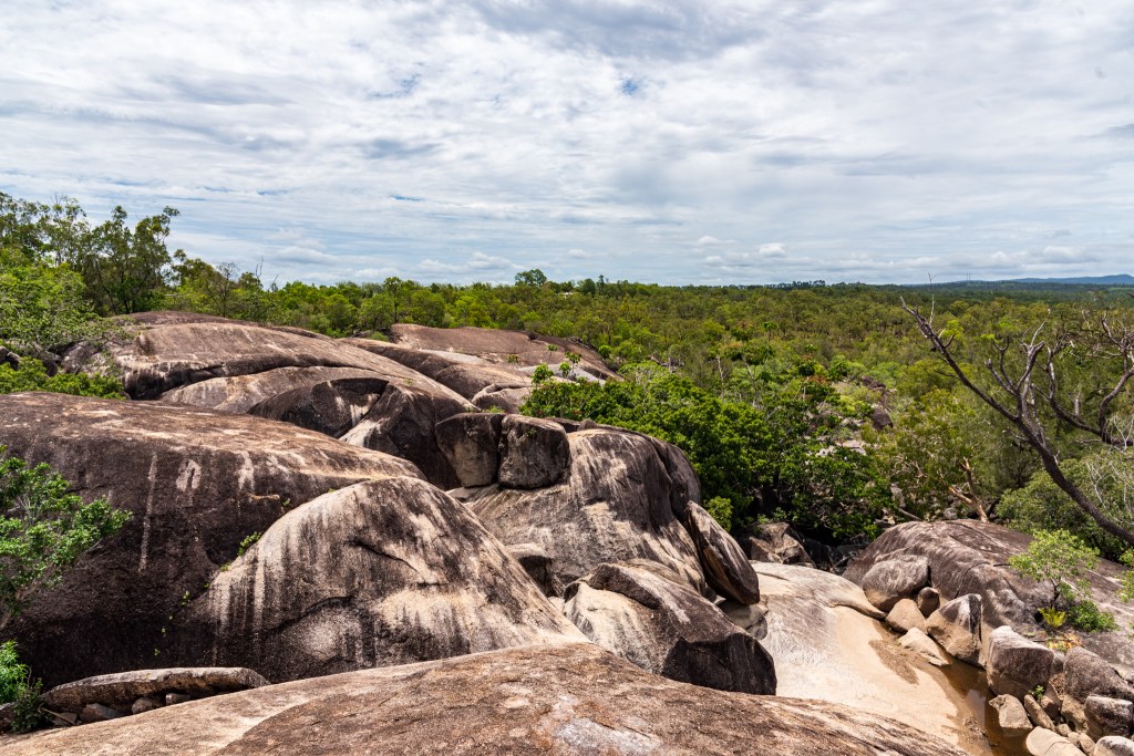 We started out with coffee in Mareeba, then impulsively turned off to follow a sign out to Granite Gorge Nature Park. With no idea what to expect, we were amazed by the huge mass of boulders which we, often fairly precariously, clambered over, under and through. The dinosaur footprints embedded in the rock were something I’ve never seen before.