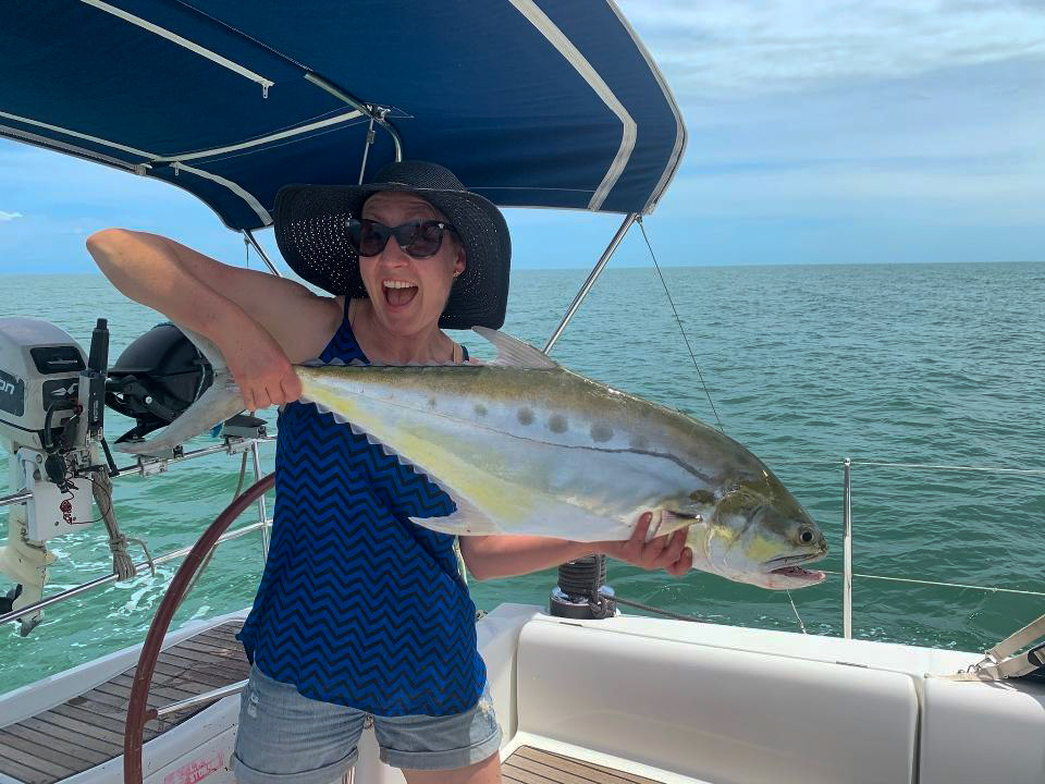 As well as snorkelling in the bay, we walked around to Nudey Beach with Mum and had a swim there. Lucas did lots of fishing off the back of the boat and he caught quite a few little fish, one of which he filleted and ate for breakfast. We often troll a lure behind the boat, and while we unfortunately had no luck while Lucas was on board, Ange managed to reel in a huge queenfish. Go Ange!