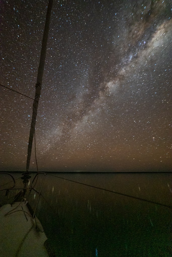 That night it was so dark and the water was so still that we could see the stars reflected in the water. The sky was bursting with bright stars and it was such a rare and special sight. After leaving Sens de la Vie and returning to Cool Change we had the lights on both yachts turned off, while Matt took some photos. Unfortunately, the full vision with the stars reflected in the water didn’t quite work out, but you can get a feeling for what we experienced.