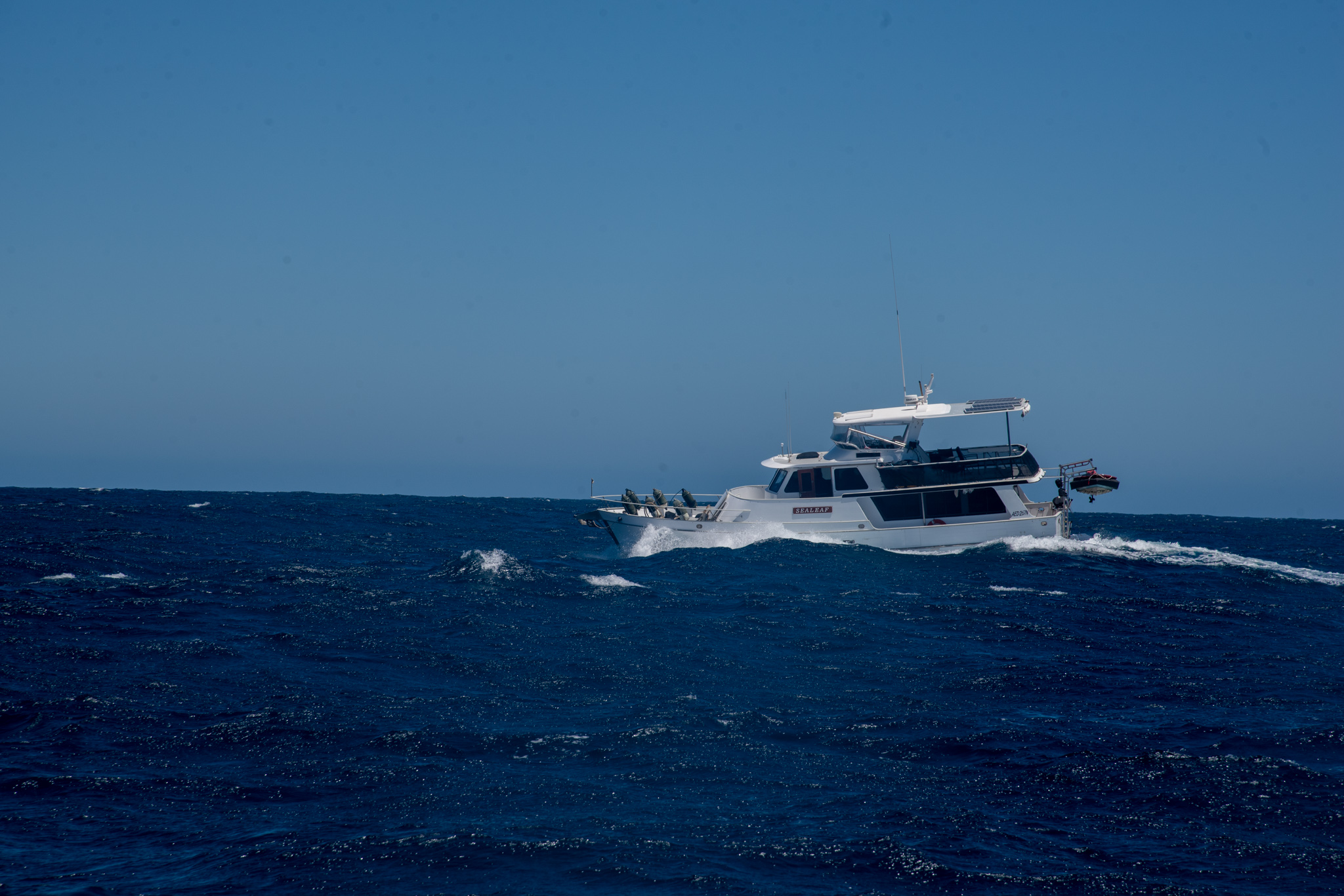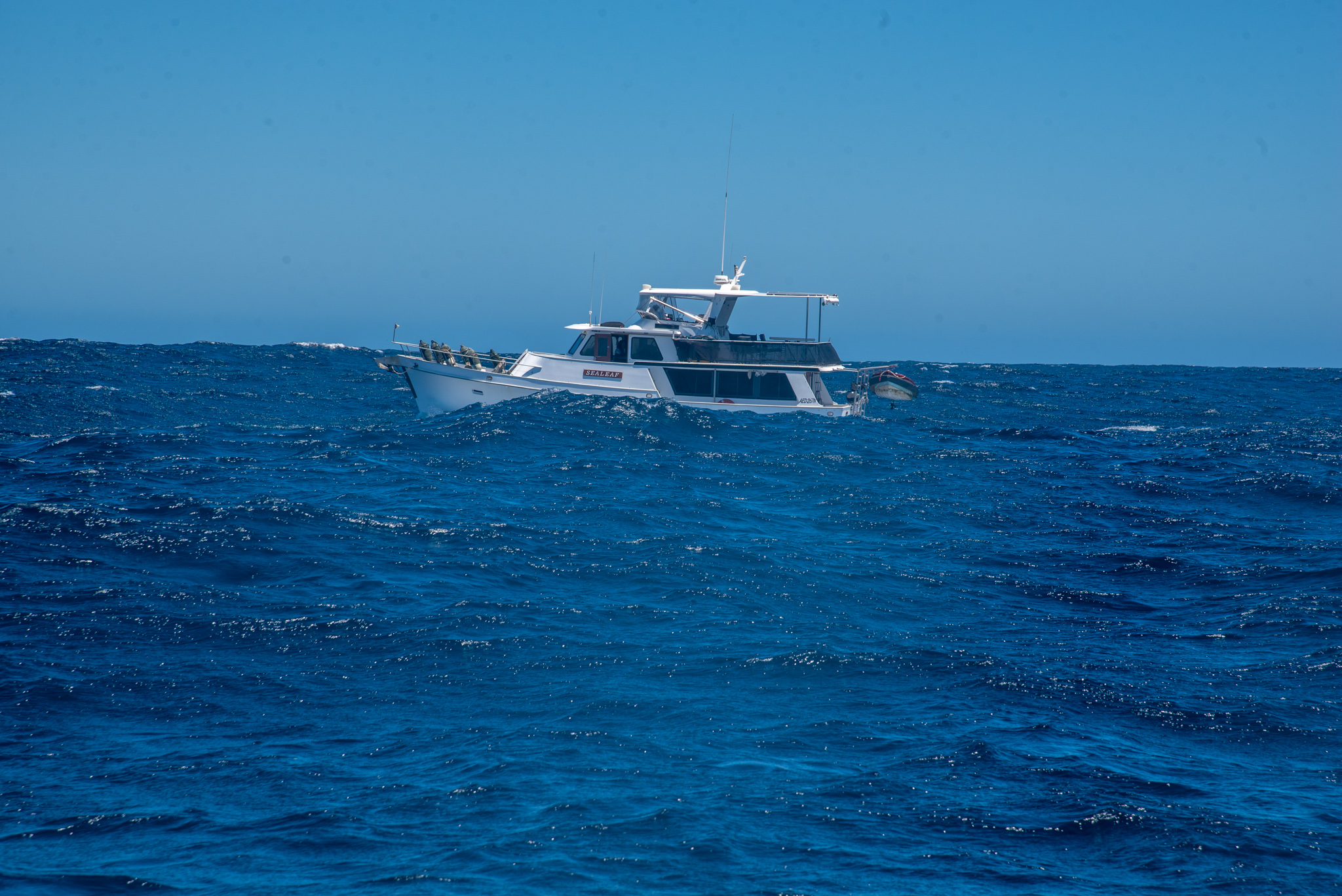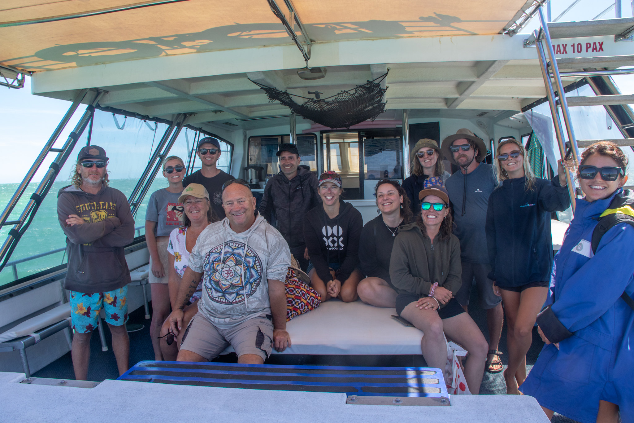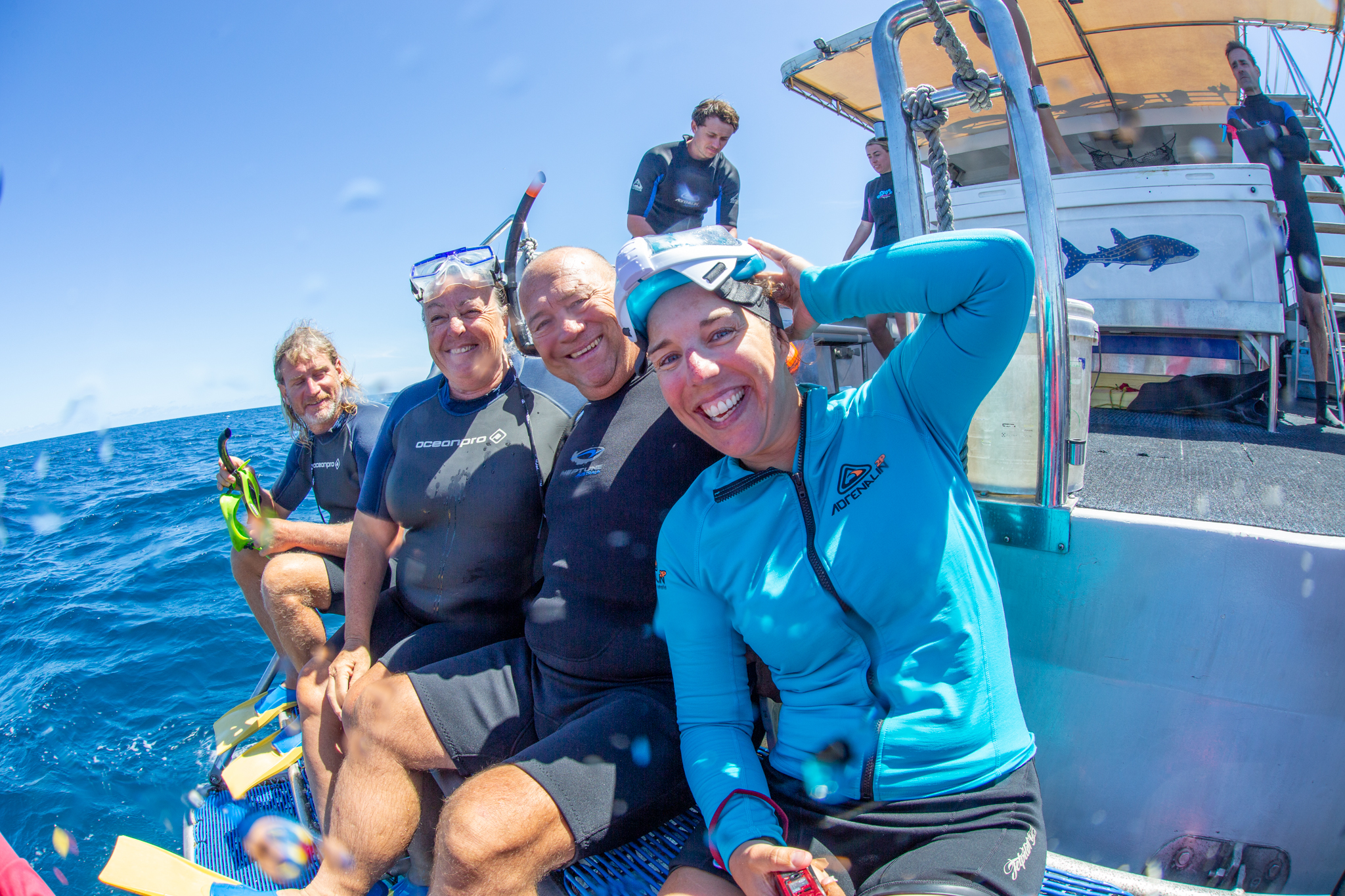 We were due to go on a tour boat to swim with manta rays the following day, but unfortunately it was cancelled at the last minute. Jase and Sarah rang around their contacts for us, but all the other boats were full. Not to be put off, Brian and Sandra decided to take Sealeaf out and see if we could find some mantas for ourselves. We invited Jason and the gang and an hour or so later Brian picked up Jason, Bella, Rock, Meeka and Mick; the tinny was overflowing as it putted back to the big boat.