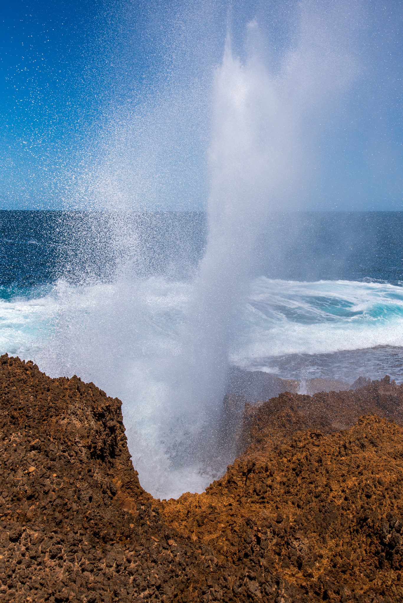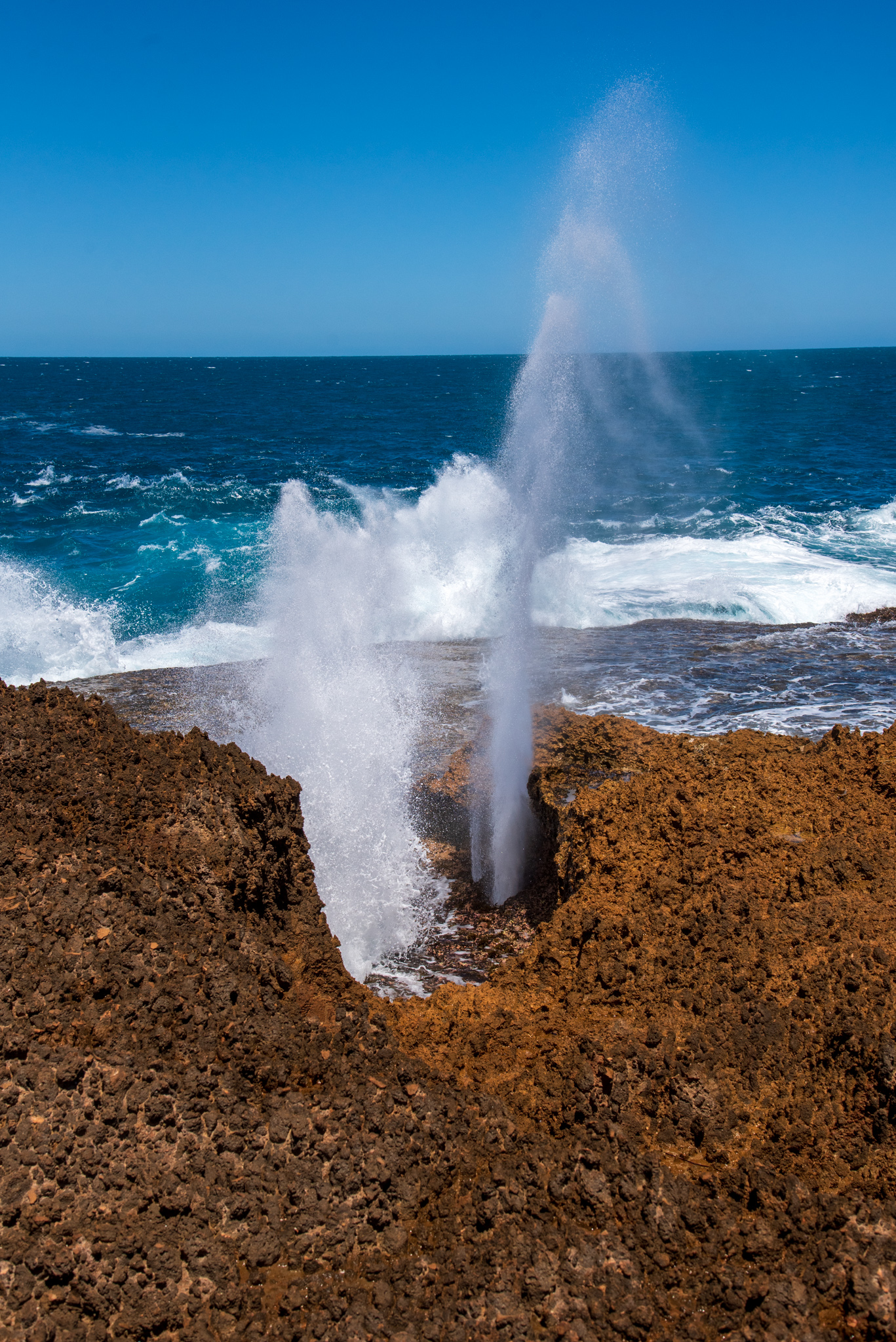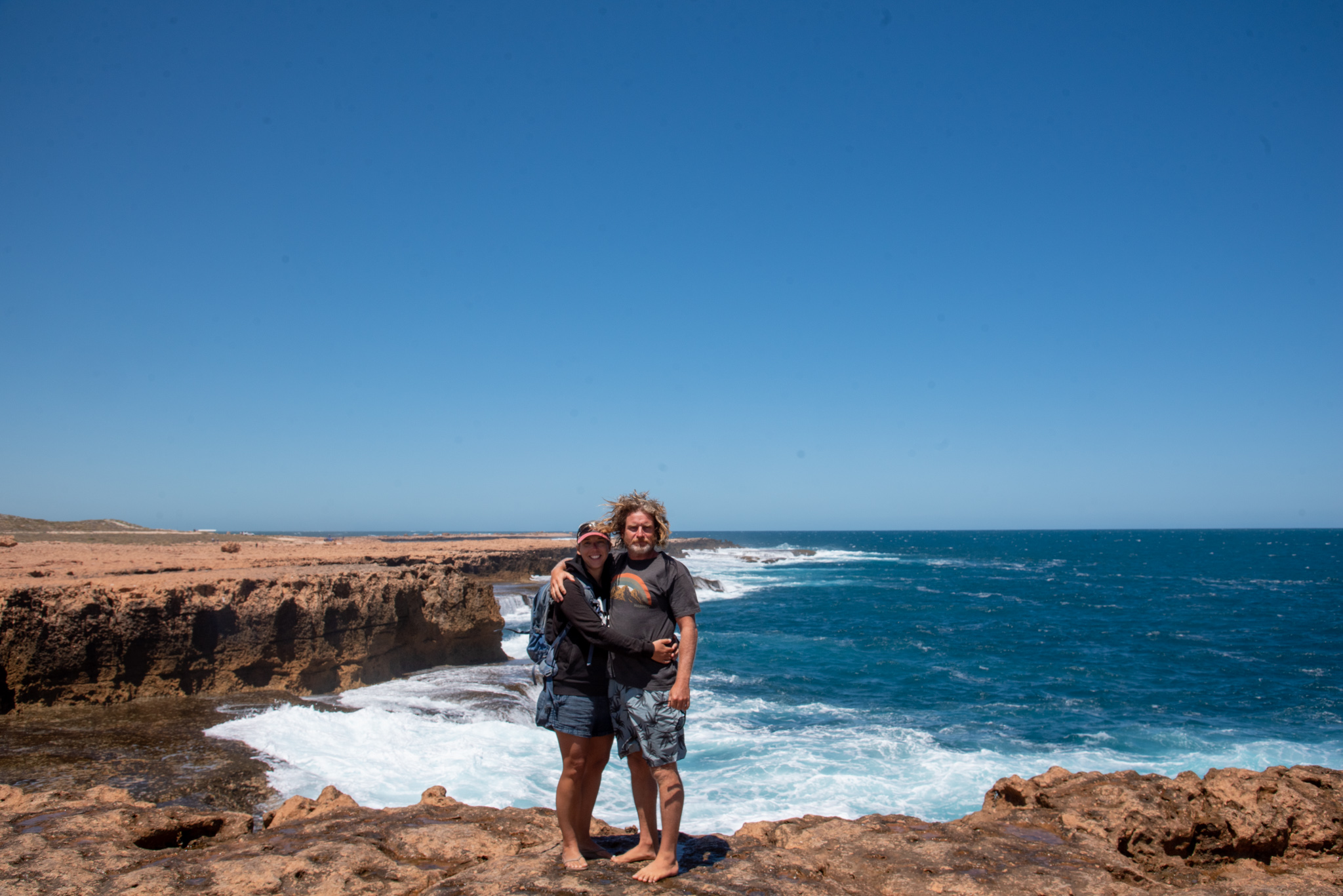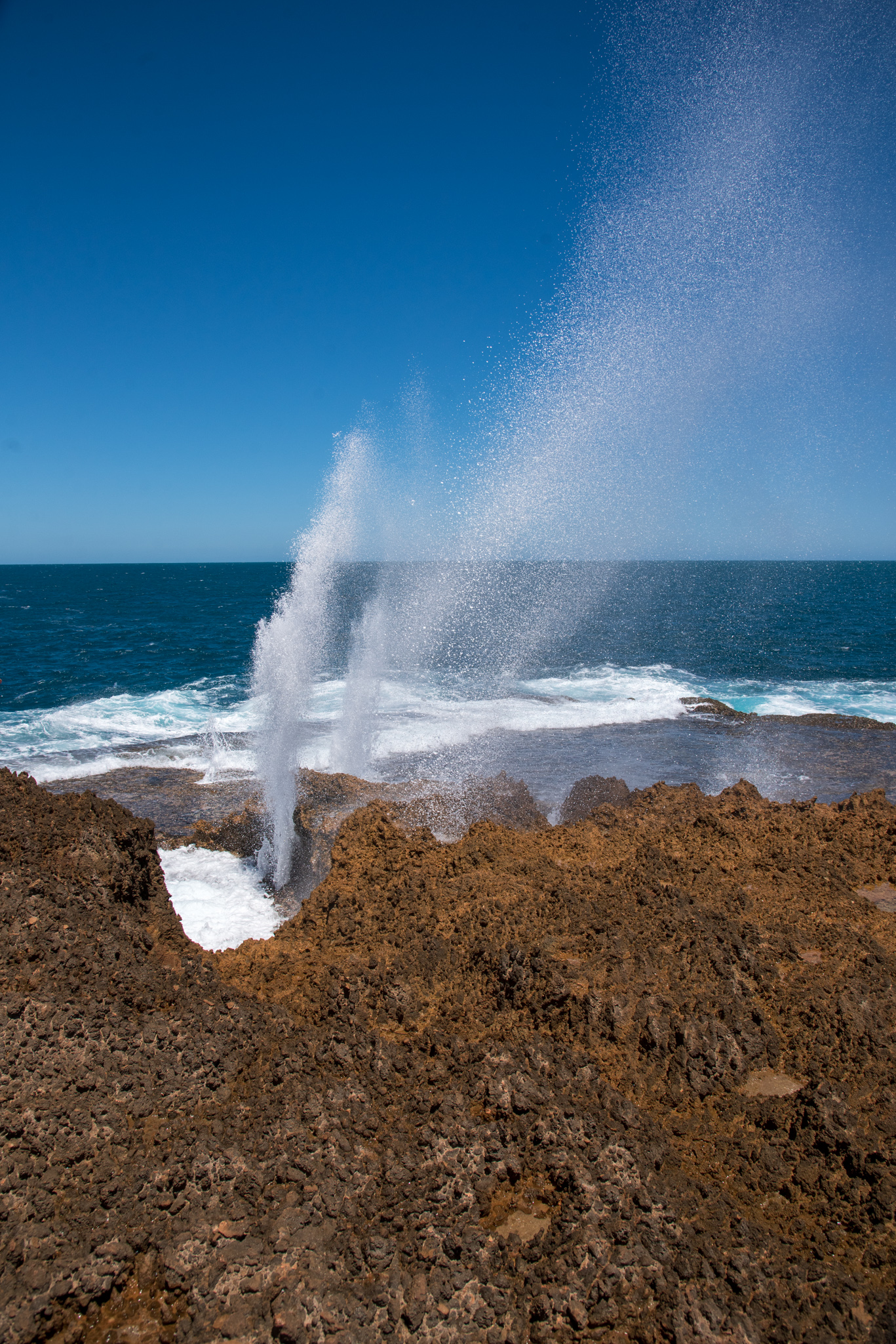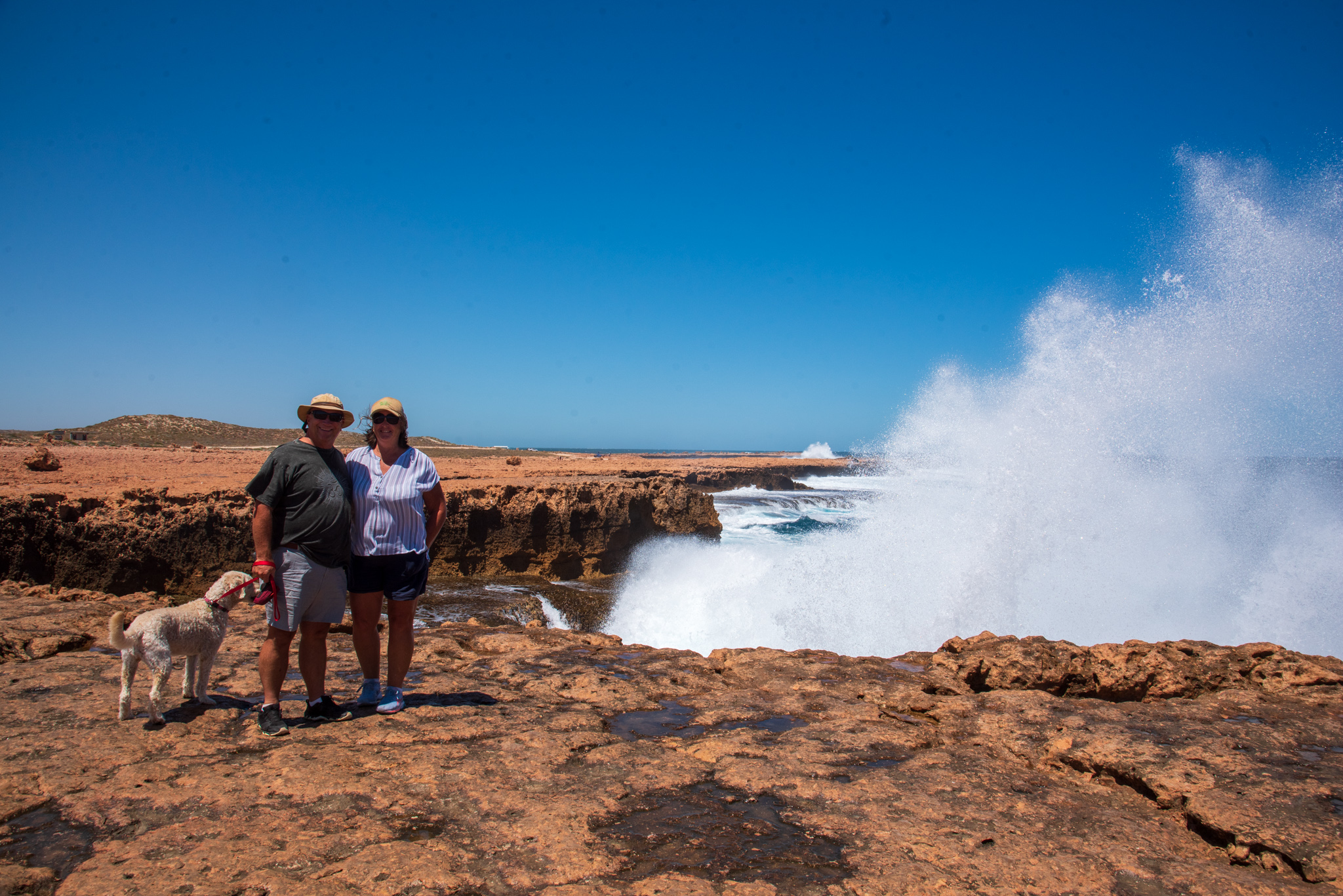 We stopped at Point Quobba to see the Quobba Blowholes. The blowholes are a natural phenomenon, caused by powerful ocean swells forcing water through sea caves and up out of narrow holes in the rocks. Jets of water erupt into the air, sometimes to a height of 20 metres. It’s a pretty spectacular sight.
