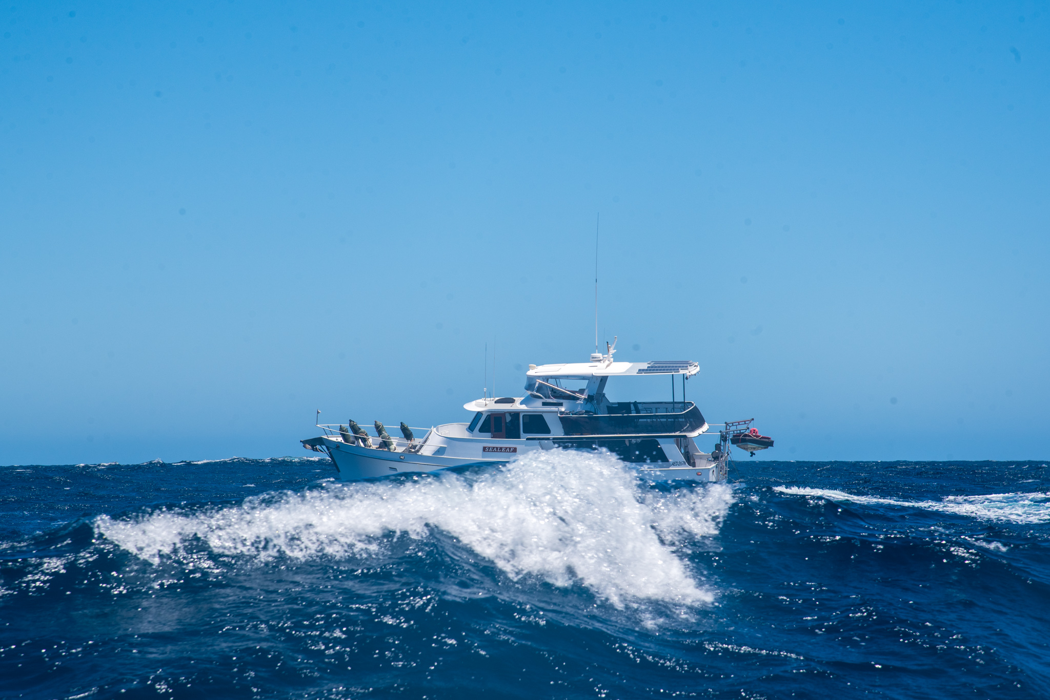 The next day we left early for our passage around to Maud’s Landing. I didn’t take a pill as I had been so drowsy the day before. This turned out to be a big mistake. It was much windier and swellier than predicted, the conditions taking us completely by surprise. The seas were huge with massive waves crashing over the boat. Everything was drenched. As Sealeaf passed us we could see the full extent of the sea conditions as they rode up and then disappeared behind the huge waves. We managed to take some photos of each other before it got really rough.