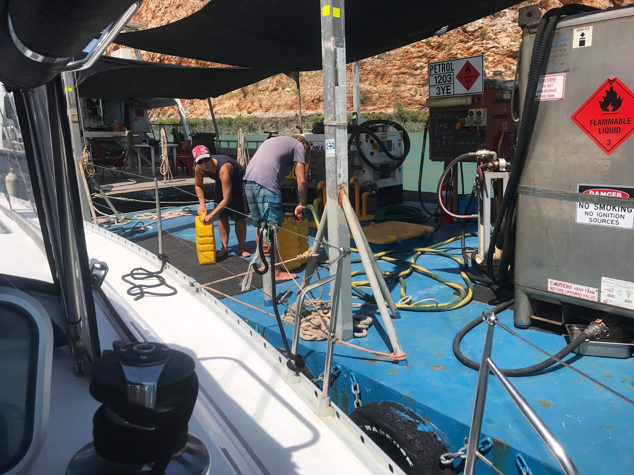 It was also deemed too dangerous to lower a tender in swell this big. So when Matt decided that it just wouldn’t be safe for him to swim across and try to climb the ladder, with me privately breathing a huge sigh of relief, it was over to option two. Brian and Sandra agreed that Sealeaf would tow Beaujolais back to Dampier. They set about trying to attach the tow line which was incredibly hard work in the big swell. Finally, after well over half an hour and many, many attempts of Sandra driving Sealeaf slowly past Beaujolais, with Brian directing at the stern, Karl managed to retrieve the tow line and the two boats were attached.
